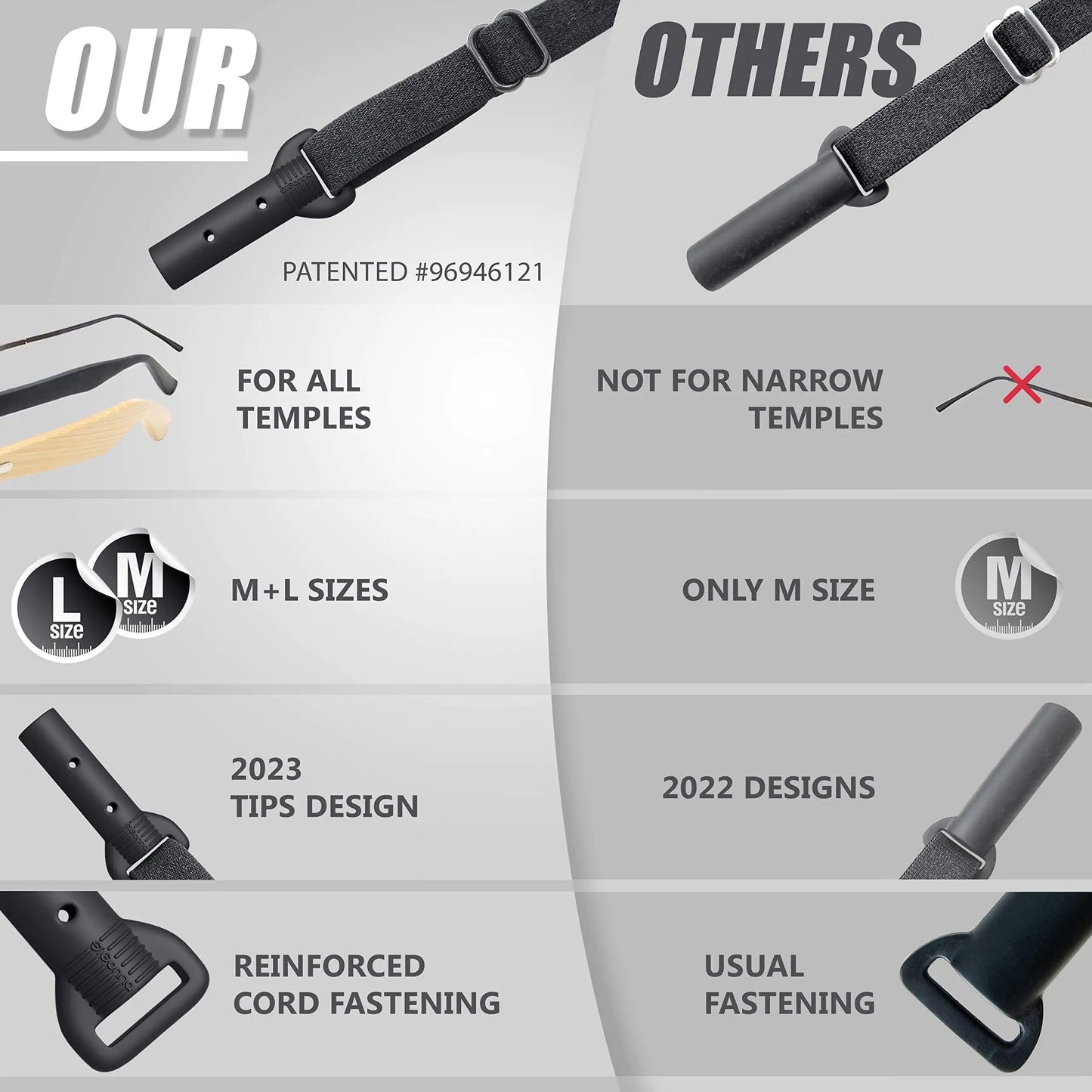 Anti-falling Patented Tips - our patented anti-slip tips of eye glass holders around head are perfect for daily usage, and the glasses lanyard will also keep your glasses while running, cycling, fishing, skiing or even climbing the mountains. The sunglass straps are perfect for extreme sports